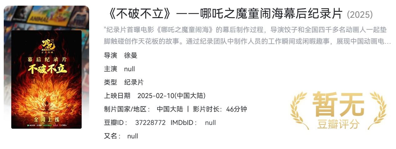 【不破不立—哪吒之魔童闹海幕后纪录片】(2025)【4K】简中字幕 【2.6G】 栏目:纪录片 作者:羊毛部落 时间:2026-01-05 15:35:04   **剧情简介:** 纪录片首曝电影《哪吒之魔童闹海》的幕后制作过程,导演饺子和全国四千多名动画人一起垫脚触碰创作天花板的故事。通过纪录团队中制作人员的工作瞬间或闲暇趣事,展现中国动画电影人不断突破想象力、突破自我、突破极限的顽"强精神与乐观态度,及"人生不设限"的价值观。 > [!success] **资源链接** > https://pan.quark.cn/s/9849913dfec8 版权声明:本站不存储任何实质资源,该帖为发布的网盘链接介绍帖。如您认为本站任何介绍帖侵犯了您的合法版权,请联系站长 ( QQ:1186810744 ) 进行投诉,我们将在确认本文链接指向的资源存在侵权后,立即删除相关介绍帖子!