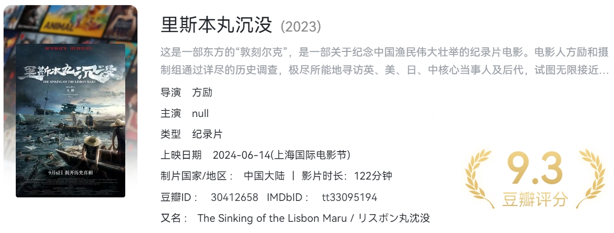 里斯本丸沉没 ( 2024 )( 4K+1080P )中字 豆瓣 9.3 强烈推荐的一部纪录片【 7.7GB 】 栏目:纪录片 作者:羊毛部落 时间:2026-01-05 15:33:13   **剧情简介:** 这是一部东方的“敦刻尔克”,是一部关于纪念中国渔民伟大壮举的纪录片电影。电影人方励和摄制组通过详尽的历史调查,极尽所能地寻访英、美、日、中核心当事人及后代,试图无限接近中国舟山东极岛附近海底30米处的二战“死亡之船”——“里斯本丸”的沉船真相。 > [!success] **资源链接** > https://pan.quark.cn/s/15bb4c4f9b4d 版权声明:本站不存储任何实质资源,该帖为发布的网盘链接介绍帖。如您认为本站任何介绍帖侵犯了您的合法版权,请联系站长 ( QQ:1186810744 ) 进行投诉,我们将在确认本文链接指向的资源存在侵权后,立即删除相关介绍帖子!