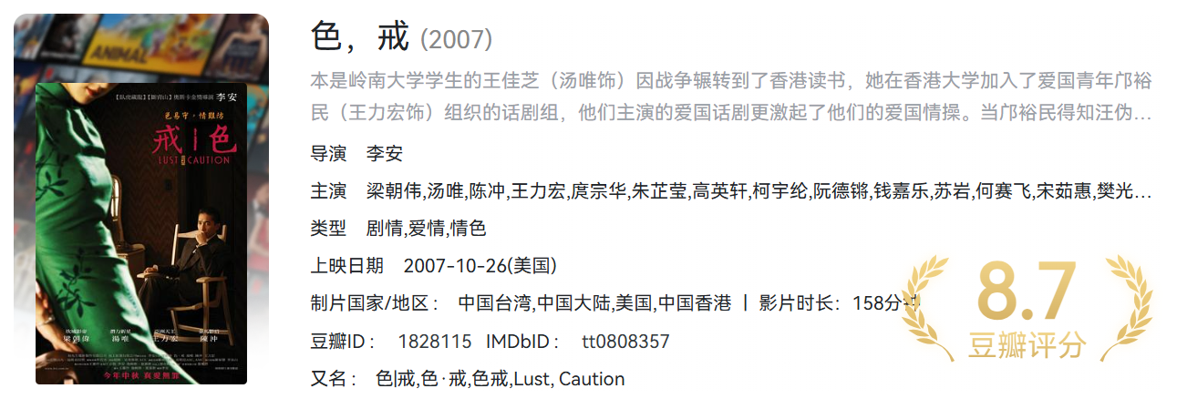 【稀缺资源】色戒 ( 2007 ) 无删减版,蓝光1080P画质,找了整整一个月才找到! 栏目:电影区 作者:羊毛部落 时间:2025-08-29 17:12:41   **简介:** 非常有名气的一部电影,上映不久就被封禁了,不了解这部电影的可以自行百度,这里就不多说了。目前在网上,这个资源非常非常难找,我也是找了整整一个月,最后在一个微店里面,花了19.9买来的。如果想看的,请自取,转存后要注意,不要在线解压,否则链接容易被和谐! > [!success] **资源链接** > [https://pan.quark.cn/s/7946ffc883f3](https://pan.quark.cn/s/7946ffc883f3 "https://pan.quark.cn/s/7946ffc883f3") 版权声明:本站不存储任何实质资源,该帖为发布的网盘链接介绍帖。如您认为本站任何介绍帖侵犯了您的合法版权,请联系站长 ( QQ:1186810744 ) 进行投诉,我们将在确认本文链接指向的资源存在侵权后,立即删除相关介绍帖子!
