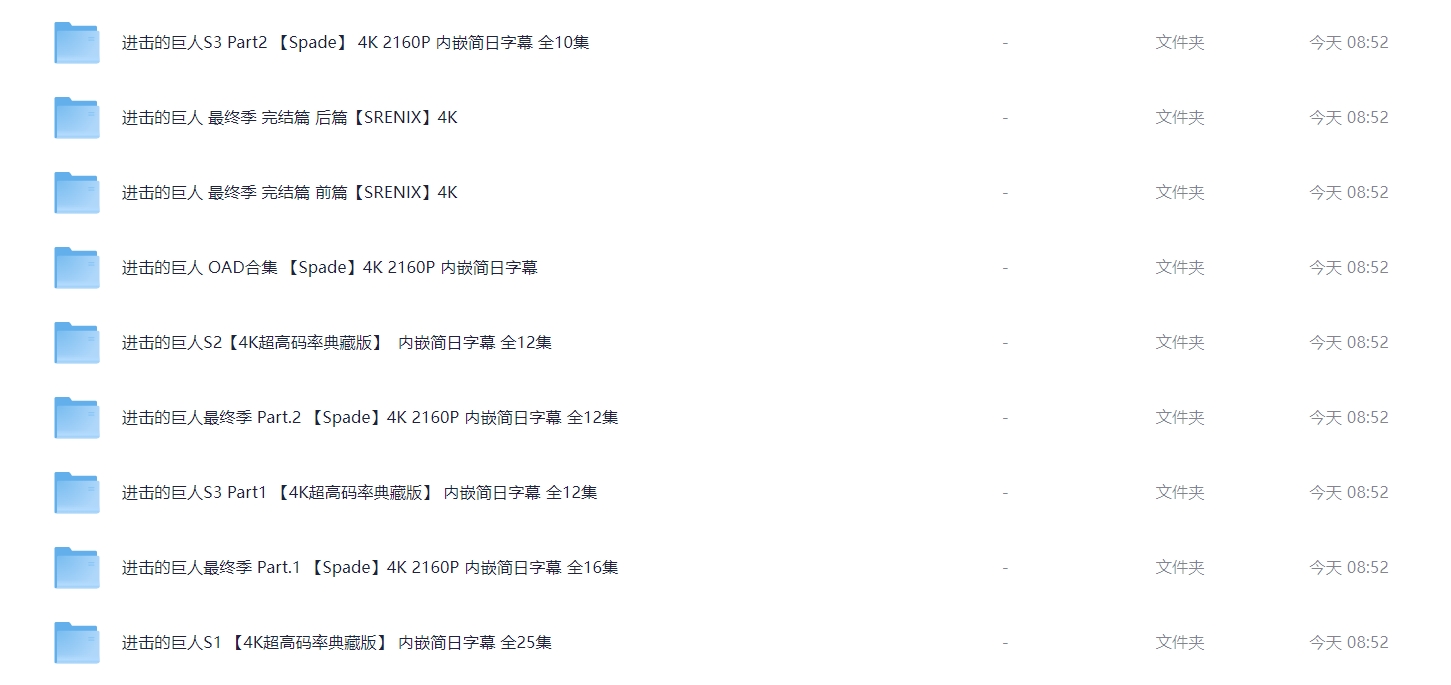《进击的巨人》全系列完结【顶级4K典藏版】 4K超高码率 单集8G 附OVA合集 【内嵌简日双语特效字幕】 814G 栏目:动漫区 作者:羊毛部落 时间:2025-11-29 12:10:53    **简介:** 《进击的巨人》(日语:進撃の巨人)是一部日本的黑暗奇幻动画连续剧,改编自漫画家谏山创的同名漫画。 故事发生在虚构世界,人们生活在由三道层层包围的巨大围墙所构成的世界中,围墙外面有着无数以人类为食的巨人。故事围绕着主人公艾伦·耶格尔和他的朋友三笠·阿克曼以及阿尔敏·阿诺德的经历展开。三人原本平静的生活因某日巨人破墙而入而随之改变,之后经历苦难的他们加入了专门对付墙外巨人的调查兵团。艾伦和他的朋友们发誓要将这世界上的巨人赶尽杀绝,并在之后的历练中成长为与巨人作战的精锐士兵。然而随着艾伦被发现也是巨人之一后,这个世界背后的真相被一点点揭开。故事的主题也由最初的热血复仇逐渐变成对世间的人性和正义的复杂解读。 本作在剧情、作画与配乐各方面出色的表现,使其在日本国内与海外的众多影视评论网站上获得接近满分的评价,**被认为是近年日本动画的代表作之一**。 > [!success] **资源链接** > [https://pan.quark.cn/s/746ea72a5001](https://pan.quark.cn/s/746ea72a5001 "https://pan.quark.cn/s/746ea72a5001") 版权声明:本站不存储任何实质资源,该帖为发布的网盘链接介绍帖。如您认为本站任何介绍帖侵犯了您的合法版权,请联系站长 ( QQ:1186810744 ) 进行投诉,我们将在确认本文链接指向的资源存在侵权后,立即删除相关介绍帖子!
