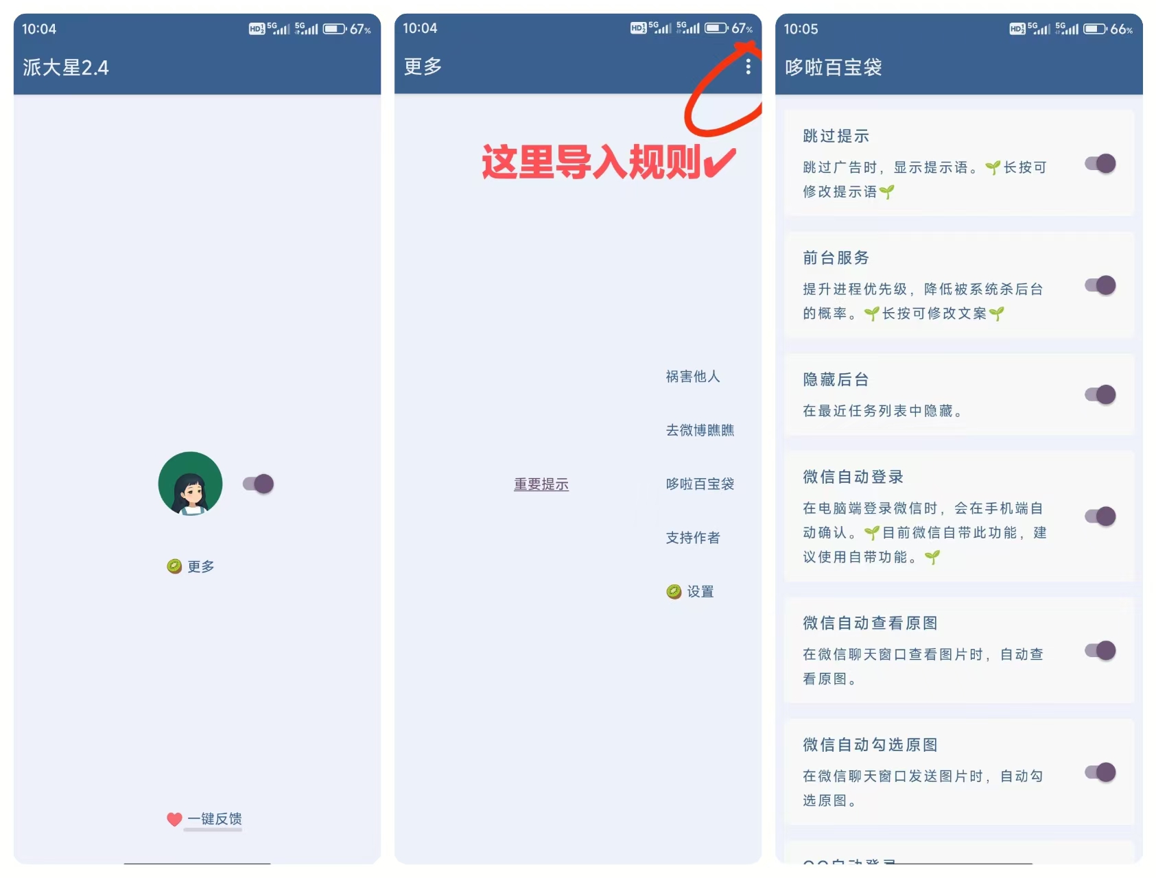 最新版李跳跳 2.4 安卓 附加5052条规则+使用方法🔥安卓手机必备! [ 3MB ] 栏目:软件区 作者:羊毛部落 时间:2025-11-19 15:27:07   **软件简介:** 李跳跳是一款可以跳过开屏广告的安卓手机软件工具。其范围广、精确高、有效“干掉”广告的特点受到众多网友好评,被戏称为“互联网药神”。 **规则使用方法:** 打开规则文件,长按输入框,调动系统自带的粘贴功能复制规则 **注意事项:** 1、不要使用输入法复制,输入法的复制字数有上限,复制的内容不完整 2、规则分为两个文件,两个文件的内容是一个整体,一定要都放进去拼接好在导入,不然会导入失败 > [!success] **资源链接** > [https://pan.quark.cn/s/e14aca2d50d8](https://pan.quark.cn/s/e14aca2d50d8 "https://pan.quark.cn/s/e14aca2d50d8") 版权声明:本站不存储任何实质资源,该帖为发布的网盘链接介绍帖。如您认为本站任何介绍帖侵犯了您的合法版权,请联系站长 ( QQ:1186810744 ) 进行投诉,我们将在确认本文链接指向的资源存在侵权后,立即删除相关介绍帖子!