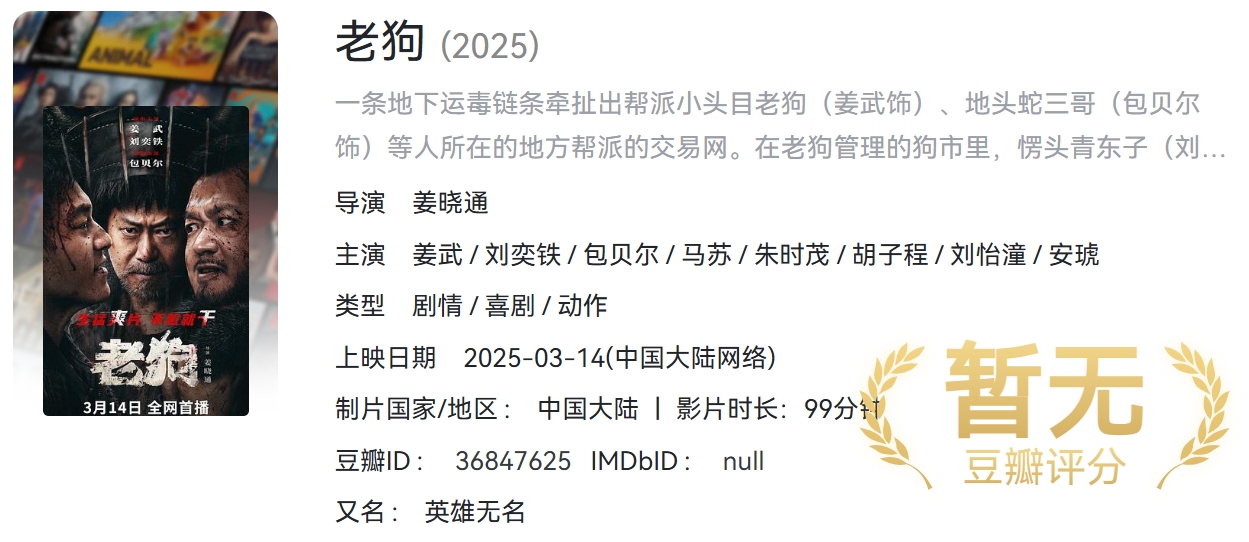 老狗 (2025)【4K / EDR / 高码率】【内封简中】【10.9GB】【姜武 / 刘奕铁 / 包贝尔】 栏目:电影区 作者:羊毛部落 时间:2025-11-28 11:34:15   **剧情简介:** 一条地下运毒链条牵扯出帮派小头目老狗(姜武饰)、地头蛇三哥(包贝尔饰)等人所在的地方帮派的交易网。在老狗管理的狗市里,愣头青东子(刘奕铁饰)阴差阳错地卷入这场漩涡中,并获得老狗赏识成为其最心腹的小弟。帮派老大葛爷的离奇暴毙,让权力真空引发惨烈厮杀,几大狠人血拼上位,神秘势力暗中操盘,然而东子的身份也似乎并不简单。在情谊和生死面前,人性赌局的考验也让事态变得越来越扑朔迷离。 > [!success] **资源链接** > [https://pan.quark.cn/s/1c9a8bd8d5be](https://pan.quark.cn/s/1c9a8bd8d5be "https://pan.quark.cn/s/1c9a8bd8d5be") 版权声明:本站不存储任何实质资源,该帖为发布的网盘链接介绍帖。如您认为本站任何介绍帖侵犯了您的合法版权,请联系站长 ( QQ:1186810744 ) 进行投诉,我们将在确认本文链接指向的资源存在侵权后,立即删除相关介绍帖子!