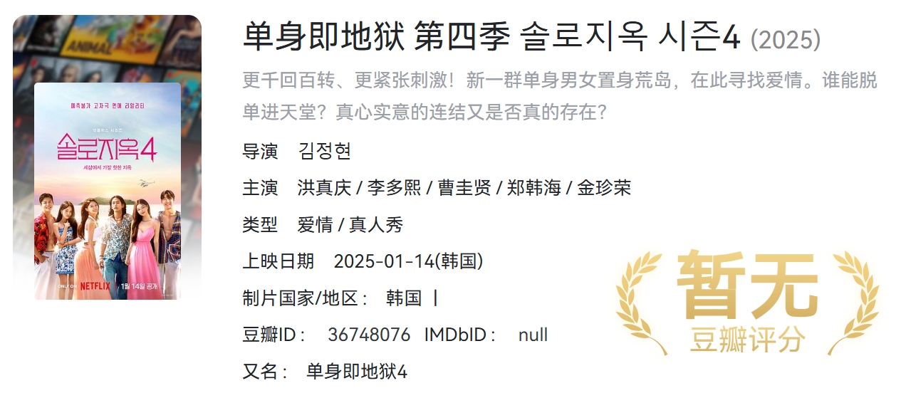 【2025韩综】《单身即地狱 第四季》 【同步更新】【附1-3季】[韩国]【1080P】【77.2G】【官中字幕】 栏目:综艺区 作者:羊毛部落 时间:2025-11-28 11:16:45   **简介:** 俊男靓女被困“地狱岛”,逃离方法只有一个:每晚与某人成为情侣。配对成功的人当晚可搬去“天堂岛”,享受优质食物和住宿,而未找到伴的人,晚上得在“地狱岛”自力更生 > [!success] **资源链接** > [https://pan.quark.cn/s/593fa9516bd2](https://pan.quark.cn/s/593fa9516bd2 "https://pan.quark.cn/s/593fa9516bd2") 版权声明:本站不存储任何实质资源,该帖为发布的网盘链接介绍帖。如您认为本站任何介绍帖侵犯了您的合法版权,请联系站长 ( QQ:1186810744 ) 进行投诉,我们将在确认本文链接指向的资源存在侵权后,立即删除相关介绍帖子!
