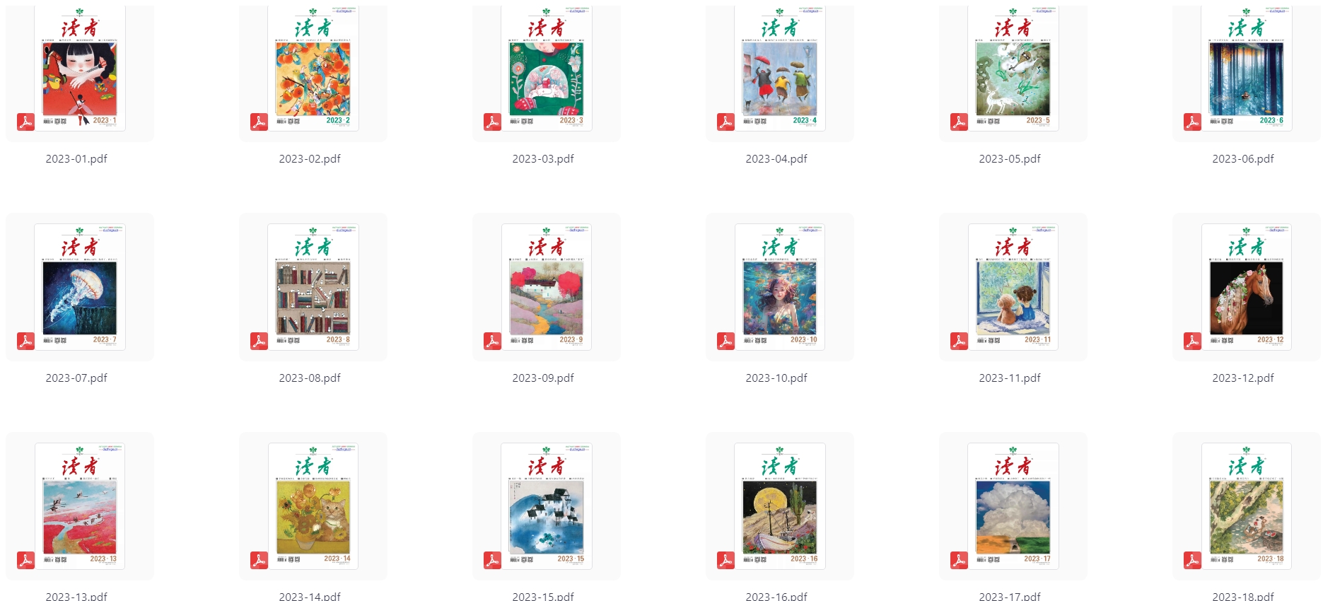 【珍藏资源】1981年-2023年《读者》系列杂志电子版全合集 栏目:书籍区 作者:羊毛部落 时间:2025-11-21 14:36:41   **简介:** 看过读者的应该都知道,当年那可是香饽饽,每隔几天都得去书亭买一本,但是现在基本上都找不到了。我也是在各种平台上找了很久才找到了这么多,**从1981年到2023年的版本基本都全了,总共276本**,**想看的自行转存,也适合想要收藏的小伙伴,毕竟这些都是小时候的回忆,再过几年估计就再也找不到了!** > [!success] **资源链接** > [https://pan.quark.cn/s/6018d5ea89d9](https://pan.quark.cn/s/6018d5ea89d9 "https://pan.quark.cn/s/6018d5ea89d9") 版权声明:本站不存储任何实质资源,该帖为发布的网盘链接介绍帖。如您认为本站任何介绍帖侵犯了您的合法版权,请联系站长 ( QQ:1186810744 ) 进行投诉,我们将在确认本文链接指向的资源存在侵权后,立即删除相关介绍帖子!